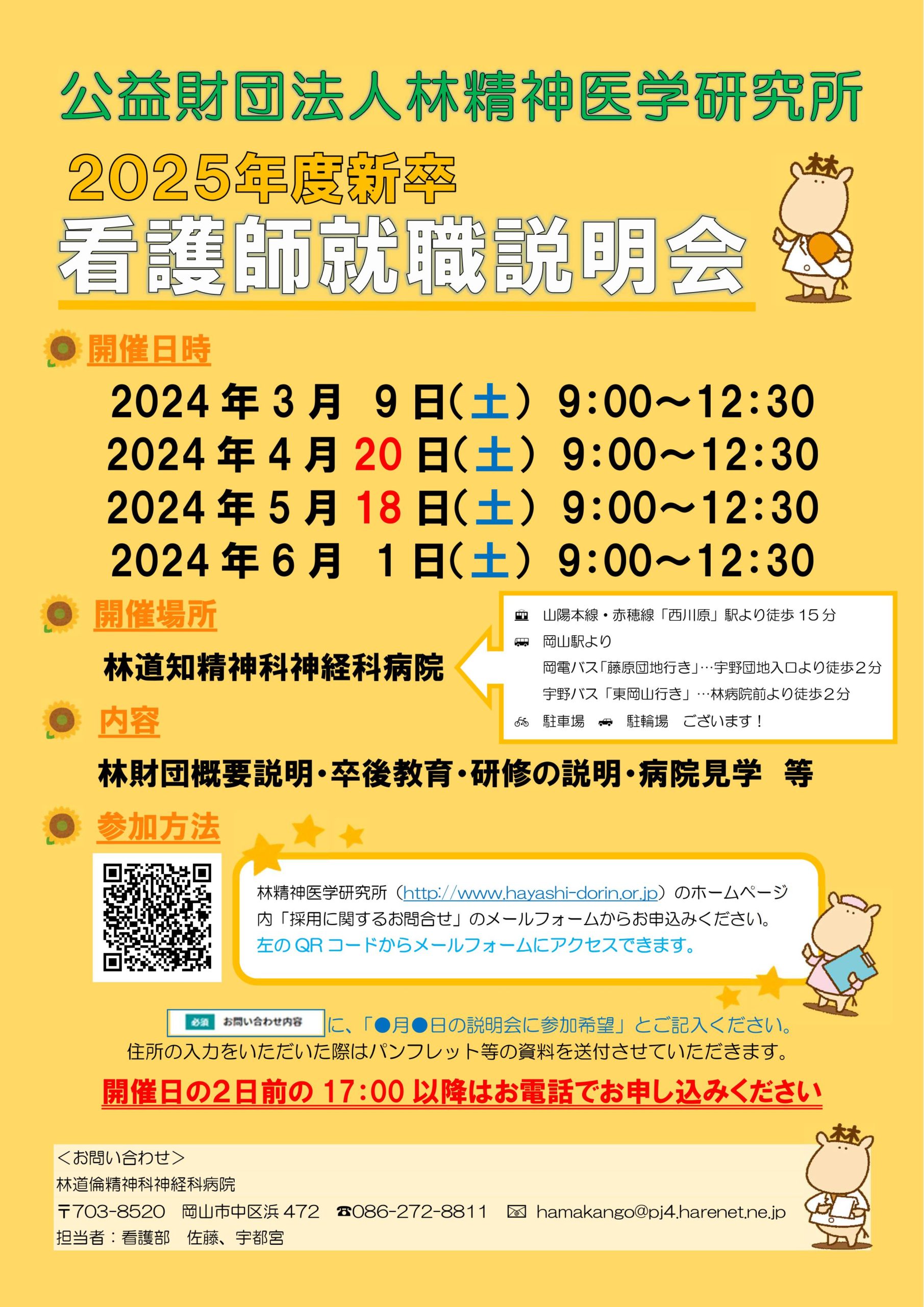 林財団概要説明・卒後教育・研修の説明・福利厚生・院内の紹介など、丁寧に説明させていただきます。ぜひご参加ください。