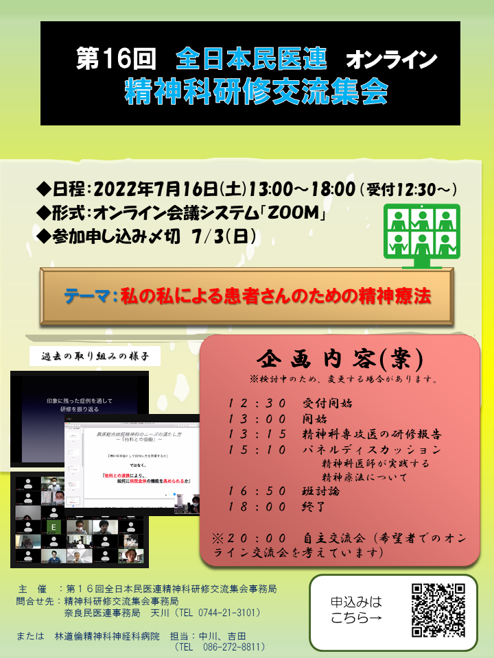 お知らせ2022.06.247/16精神科研修交流集会 精神科に興味のある研修医、医学生向けのWEB企画「精神科研修交流集会」を開催します。 精神療法についてのパネルディスカッション、専攻医による研修報告があります。 ご興味のある方は、チラシをご覧の上チラシのQRコードもしくは下記リンクから申し込みお願いします。 お申し込みはこちら!