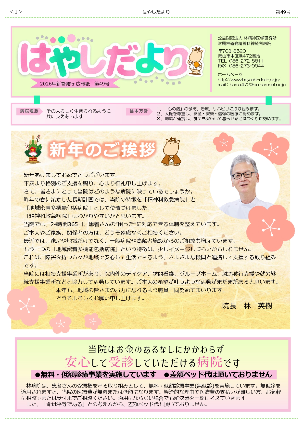 「はやしだより」は医療の取り組みの他、イベントの様子、医師やスタッフからのコラム・記事などを掲載する広報紙です。