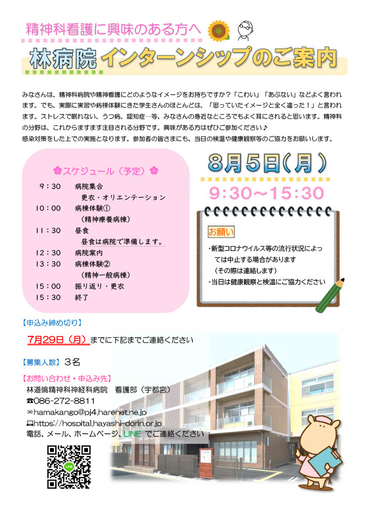 内容:病棟に入り、看護体験や病院見学をしていただきます